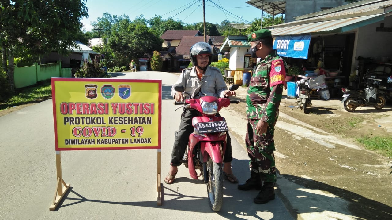 Landak : Koramil Air Besar, Kodim 1201/Mph memberi teguran keras kepada 15 orang yang tidak menggunakan masker saat melaksanakan penegakan rutin disiplin protokol kesehatan (Prokes) di Jalan Raya Serimbu, Kecamatan Air Besar, Kabupaten Landak, Senin (24/5/2021).