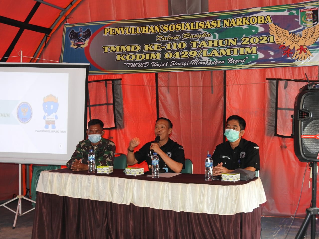 Lampung Timur, Satgas TNI Manunggal Membangun Desa (TMMD) Reguler Ke-110 TA. 2021 Kodim 0429/Lamtim selain melaksanakan sasaran fisik juga melaksanakan sasaran non fisik, Salah satunya adalah Sosialisasi Pencegahan Pemberantasan Penyalahgunaan dan Peredaran Gelap Narkoba (P4GN), yang dilaksanakan di Posko TMMD, Desa Sukorahayu, Labuhan Maringgai, Sabtu (20/3/2021).