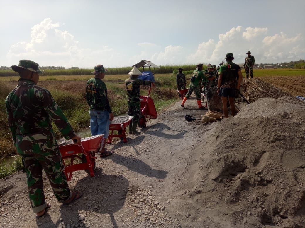 PATI – TMMD 111 Kodim 0718/Pati, baru berjalan 3 hari, berlangsung di Desa Tamansari, Kecamatan Jaken, Kabupaten Pati, Kamis (17/06/2021). Namun selain dipakai untuk pemindahan material keras seperti batu, pasir, dan juga semen, mengggunakan angkong atau gerobak dorong untuk pengecoran.