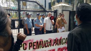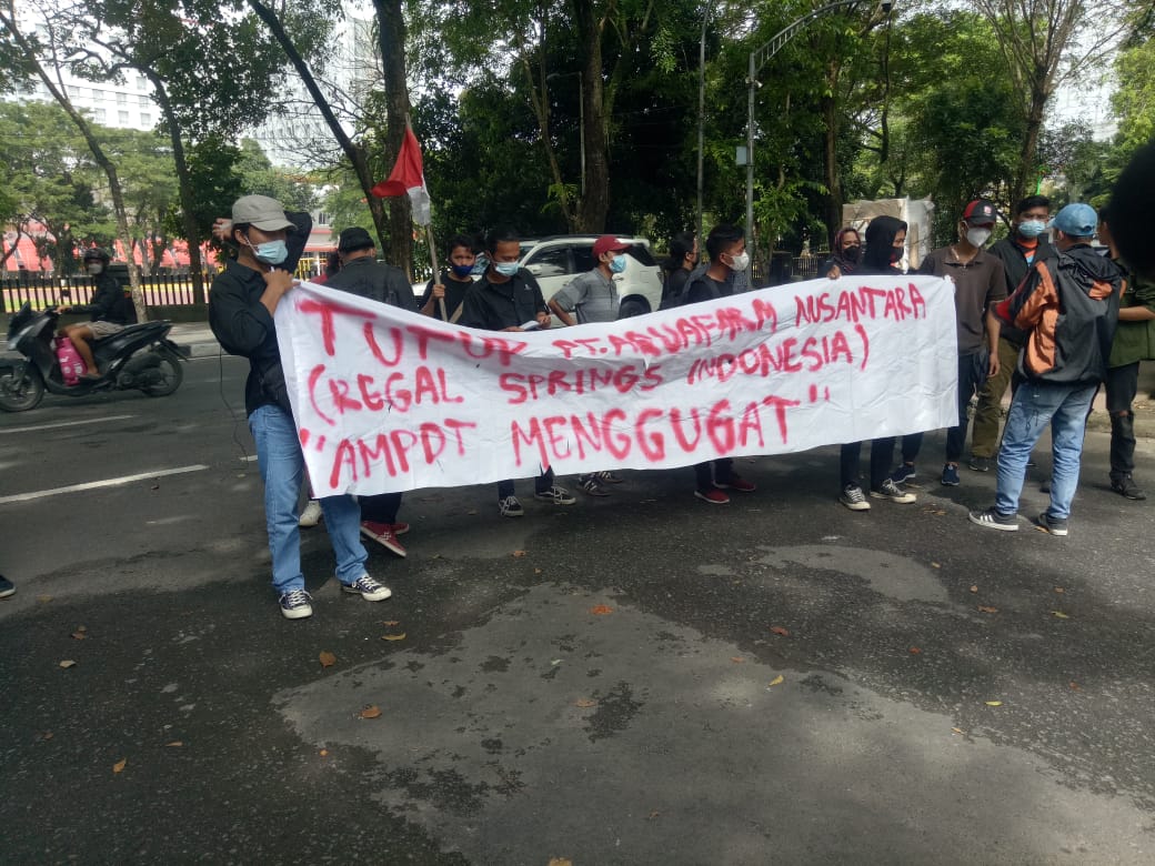 Mereka lalu membentangkan spanduk yang isinya untuk menutup kegiatan PT. Aquasfarm Nusantara yang telah berganti nama menjadi Regal Spring Indonesia. Selain itu mereka juga melakukan Orasi secara bergantian di depan gerbang Kantor DPRD Sumut.