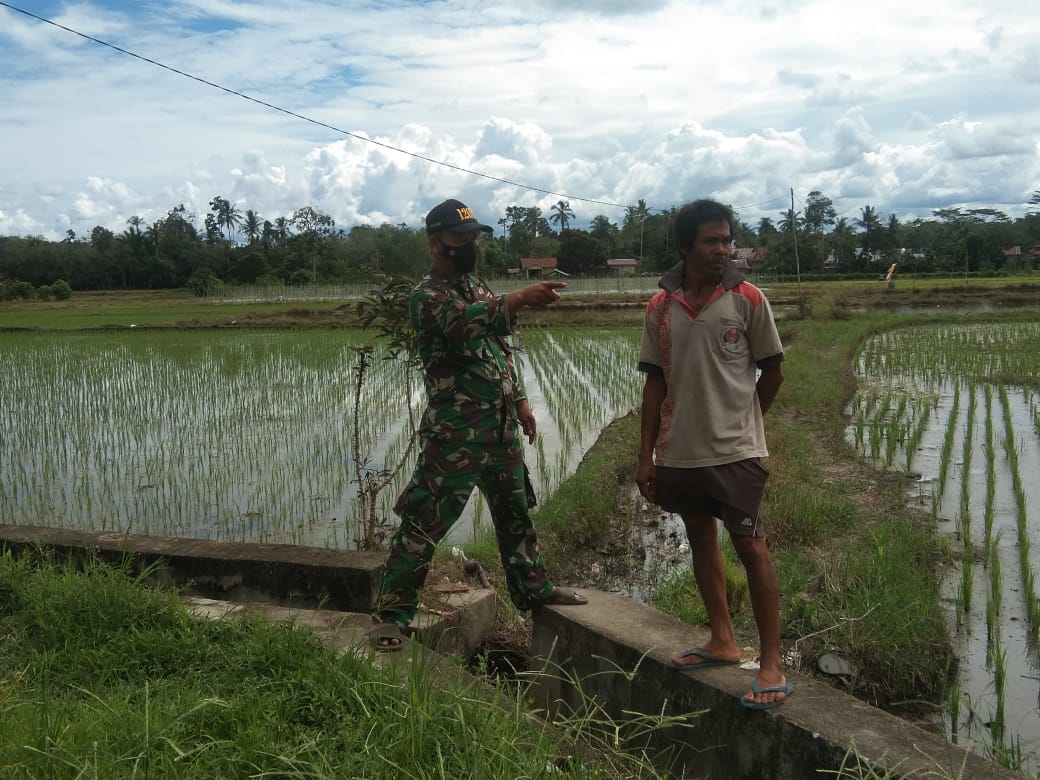 Landak – Babinsa Koramil 1201-06/Menjalin, Serda Barus melaksanakan komunikasi sosial (Komsos) sekaligus melakukan pendampingan kepada petani padi di Dusun Sungai Bandung, Kecamatan Menjalin, Kabupaten Landak, Jumat (18/6/2021).