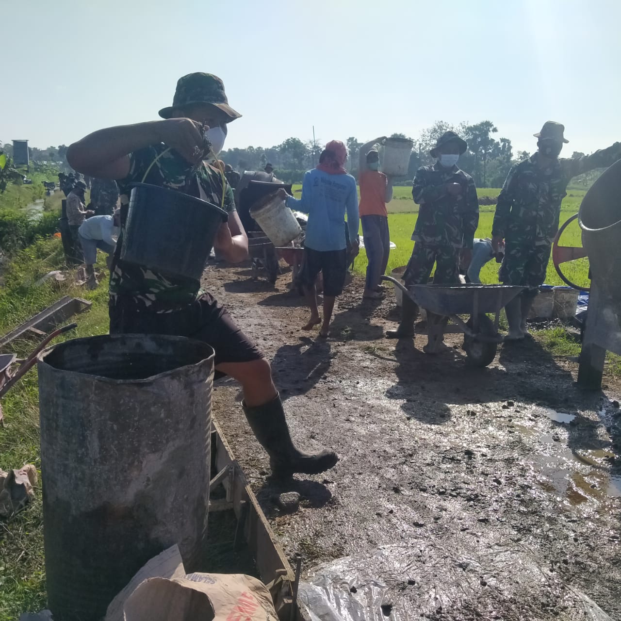 TNI itu Koptu Tono, ia mengambil air dari drum tampungan untuk dimasukan ke mesin molen, sebelum semen dan bahan lainya dituangkan.