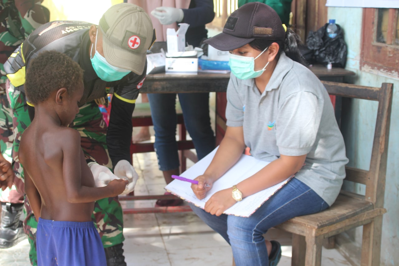 MERAUKE – Anak-anak Kampung Okor Distrik Haju Kabupaten Mappi, mendapatkan pelayanan kesehatan berupa pemberian obat cacing dari tim kesehatan personel Satgas TMMD ke-112 Kodim 1707/Merauke bersama petugas kesehatan Puskesmas Haju.