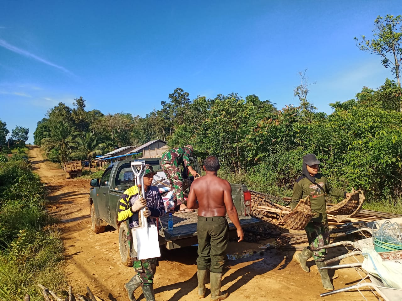 “Kami mempersiapkan peralatan sebelum menuju ke titik sasaran yang akan kami kerjakan hari ini, dengan menggunakan mobil kami beserta peralatan meluncur ke sasaran,” ujar Serda Yanto, Anggota Satgas TMMD 111 Kodim 1202/Skw.