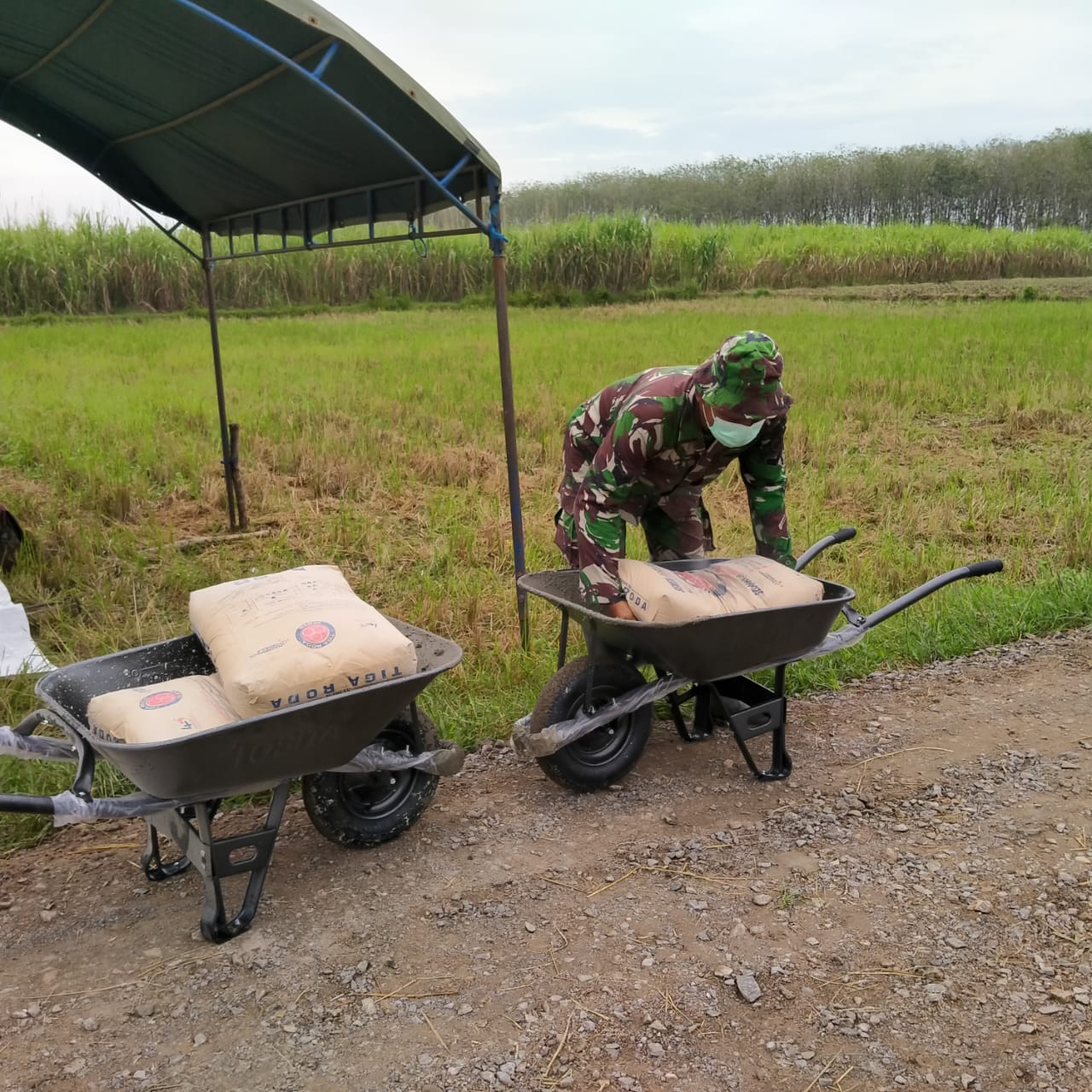 ini terlihat ketika salah satu anggota TNI yang sedang mengangkut semen dengan gerobak dorong artco, untuk kemudian didekatkannya ke mesin molen sebagai bahan utama dari pembuatan adukan beton.
