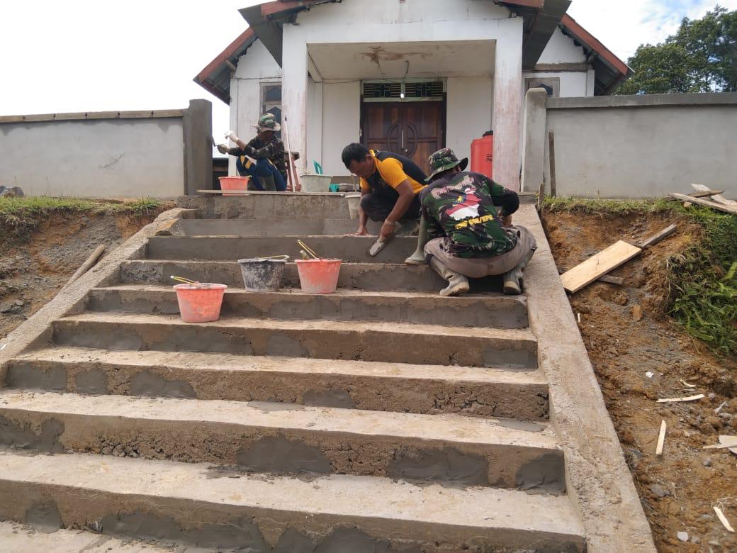 Bengkayang – Dengan bahu membahu anggota Satgas TMMD Regtas Ke-111 Kodim 1202/skw, mengerjakan plester anak tangga Gereja Desa Sentangau jaya kec. seluas kab. bengkayang.