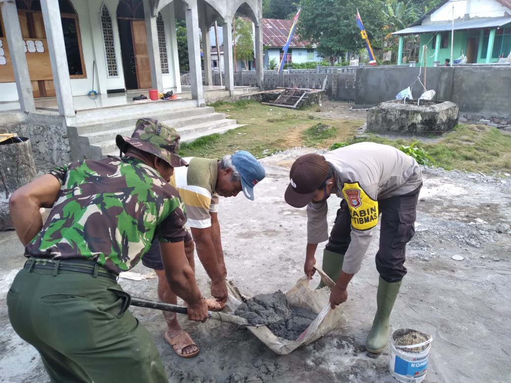 Anggota satgas TMMD Ke 111 Kodim 1501/Ternate dan Babinkamtibmas bersama warga masyarakat saling membantu dalam pengerjaan fisik berupa mengaduk Semen yang akan digunakan untuk sasaran-sasaran fisik di Kelurahan Tafamutu Kecamatan Moti.