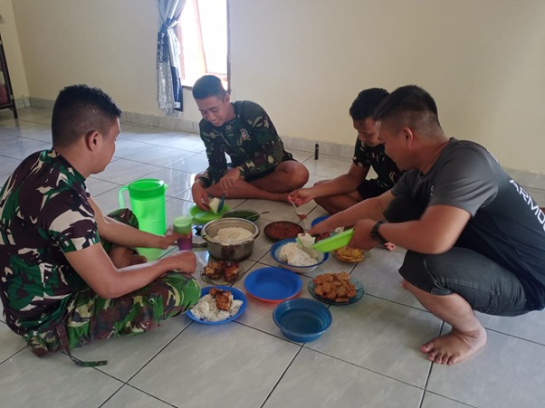 Kubu Raya – Anggota satgas TMMD ke-111 Kodim 1207/Pontianak Serka Fajar dan anggota lainnya melaksanakan makan siang bersama disalah satu rumah warga Dusun Maju Jaya, Desa Kuala Mandor B, Kecamatan Kuala Mandor B, Kabupaten Kubu Raya, Rabu (23/06/2021).