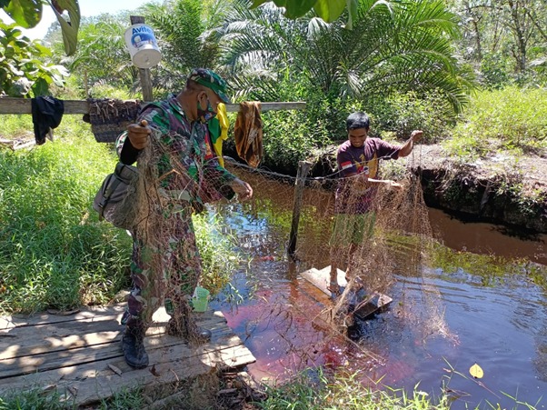 “Melihat warga kerja sendirian dan kelihatan susah memasang atau menggelar jaring pukatnya di sungai kecil, saya segera mendekati dan membantu menyelesaikan apa yang dikerjakannya” kata Serda Rahmanta.