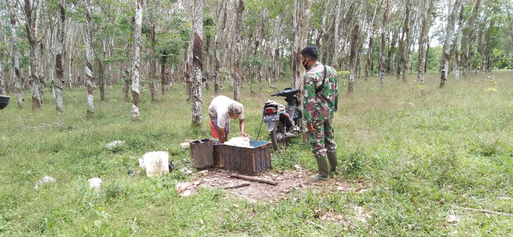 Perbincangan Serda Suprapto dengan bapak Sugeng tentang harga karet saat ini yang telah mencapai Rp. 8.000,- perkilo nya.