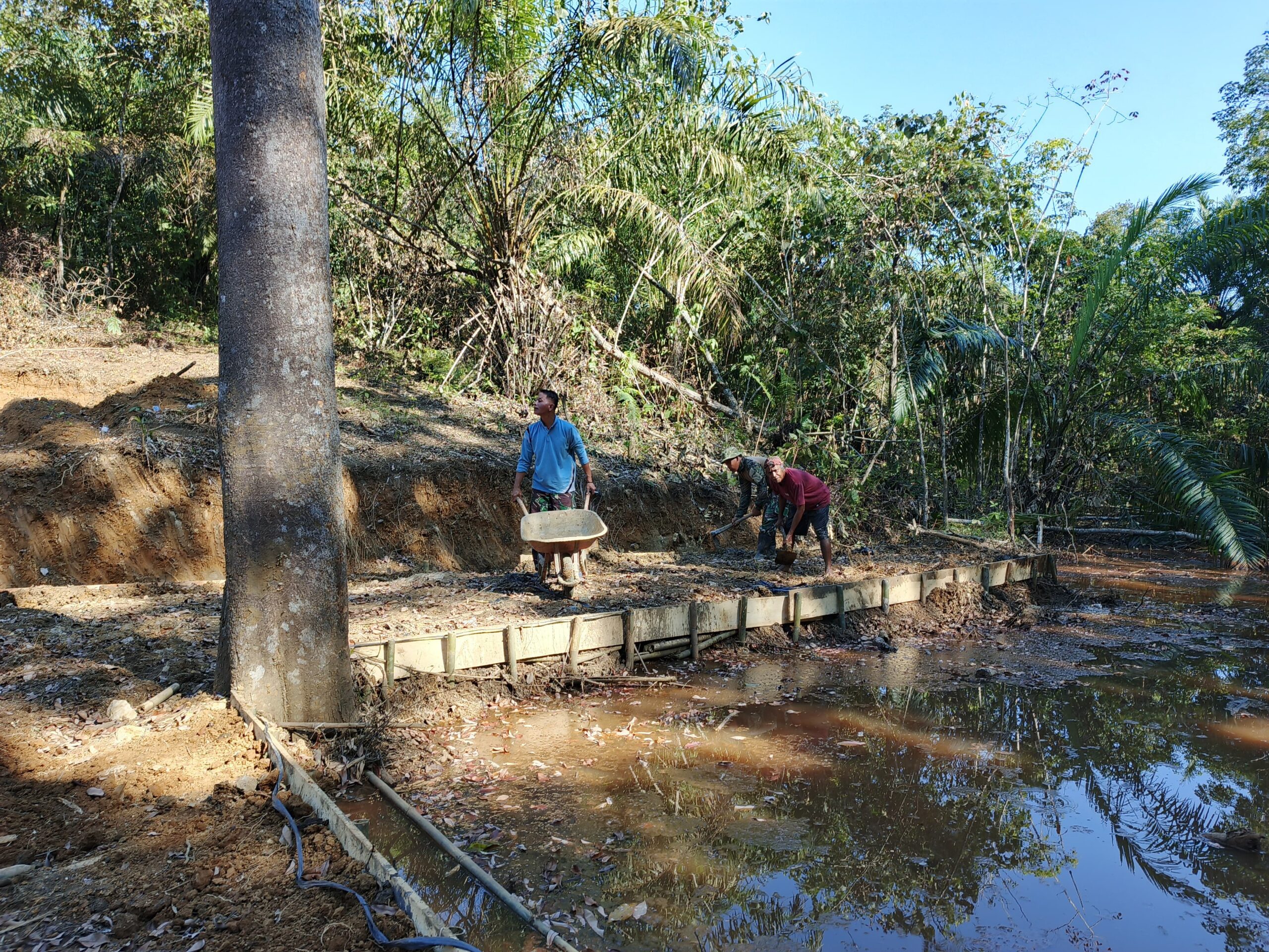 Merangin-Anggota Satgas TNI Manunggal Membangun Desa (TMMD) Ke-122 Kodim 0420/Sarko Serda Hendrawadi, melakukan kegiatan merapikan tanah menuju kolam di lokasi ketahanan pangan.