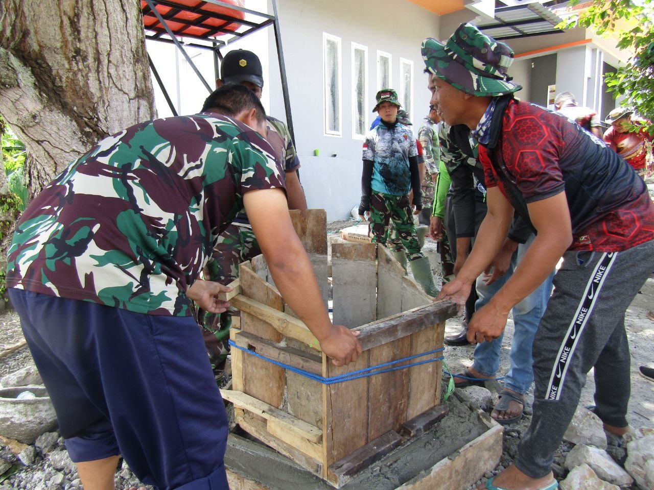 Anggota Satgas TMMD mengerjakan pembangunan tugu prasasti TMMD sudah masuk tahap pengerasan rangka model prasasti dan pembuatan tunggu ini harus dimulai dari sekarang agar bisa rampung sesuai waktunya.