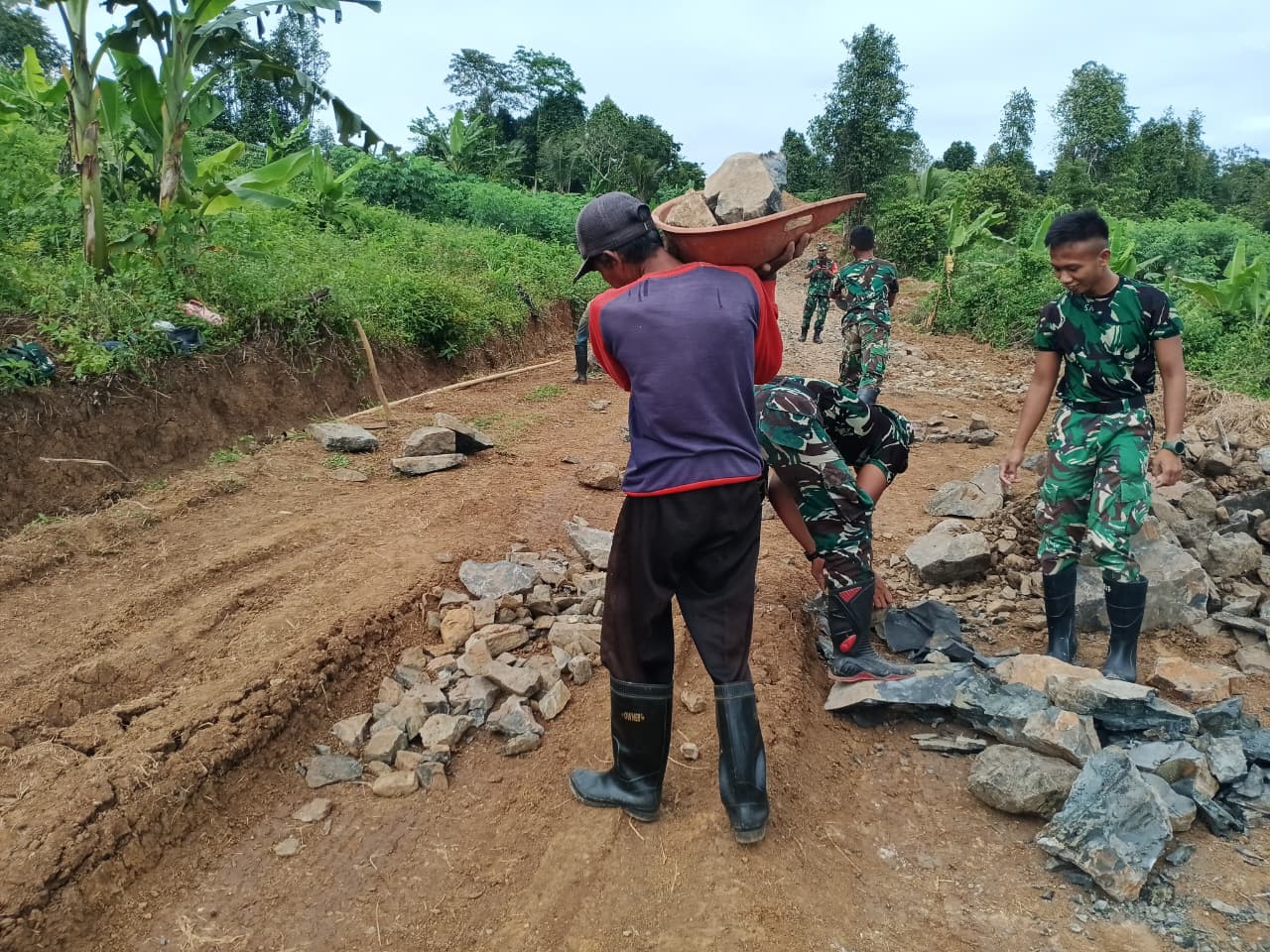 Di bawah terik matahari pagi yang hangat, tampak para prajurit TNI dengan semangat pantang menyerah bekerja bergotong royong bersama masyarakat. Mereka bahu-membahu menata batu kali dan meratakan badan jalan agar hasil pekerjaan nantinya kokoh dan dapat dilalui kendaraan dengan aman serta nyaman. Semangat kebersamaan antara TNI dan warga menjadi pemandangan yang penuh makna, menggambarkan kuatnya sinergi antara aparat pertahanan dengan rakyat dalam mewujudkan pembangunan desa.