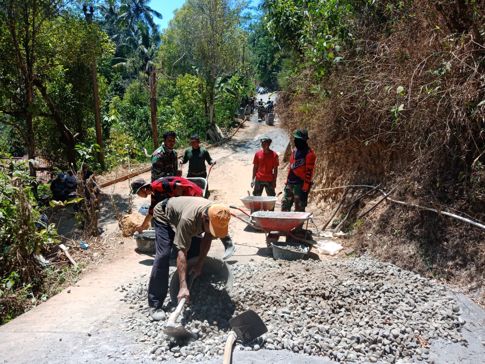“Anggota Satgas TMMD bersama warga masyarakat desa Benowo masih terus melanjutkan pembangunan di berbagai sasaran fisik, walaupun awal melakukan pengecoran jalan terdampak material yang jauh menuju titik awal pengecoran.