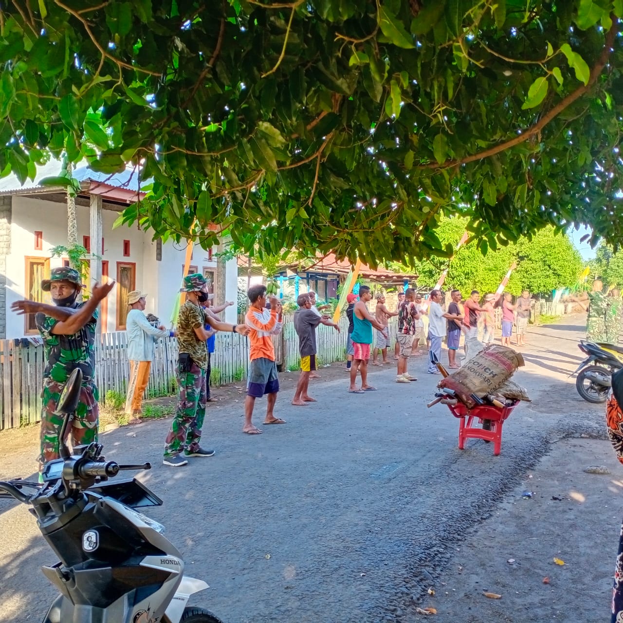 Anggota Satgas TNI Manunggal Membangun Desa (TMMD) 111 Kodim 1501/Ternate melakukan senam pagi sebelum pergi menuju sasaran pekerjaan pembangunan,Rabu (23/6/2021).