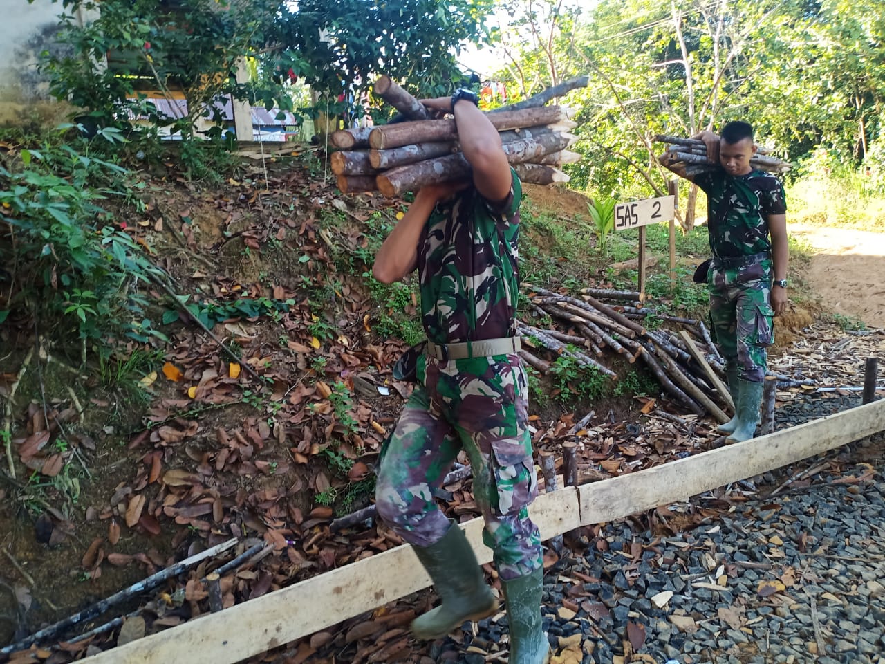Anggota satgas TMMD mencari kayu bakar untuk keperluan memasak makan kebutuhan anggota satgas, dan peralatan yang digunakan juga sangat sederhana yang tersedia dari alam.