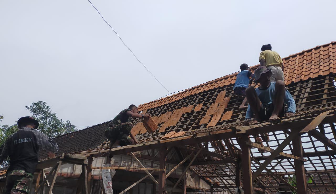 “Kita bergotong-royong memasang genteng rumah Bu Surati, kita pasang bersama-sama warga dengan gotong-royong,” kata Serda Lajahidin.