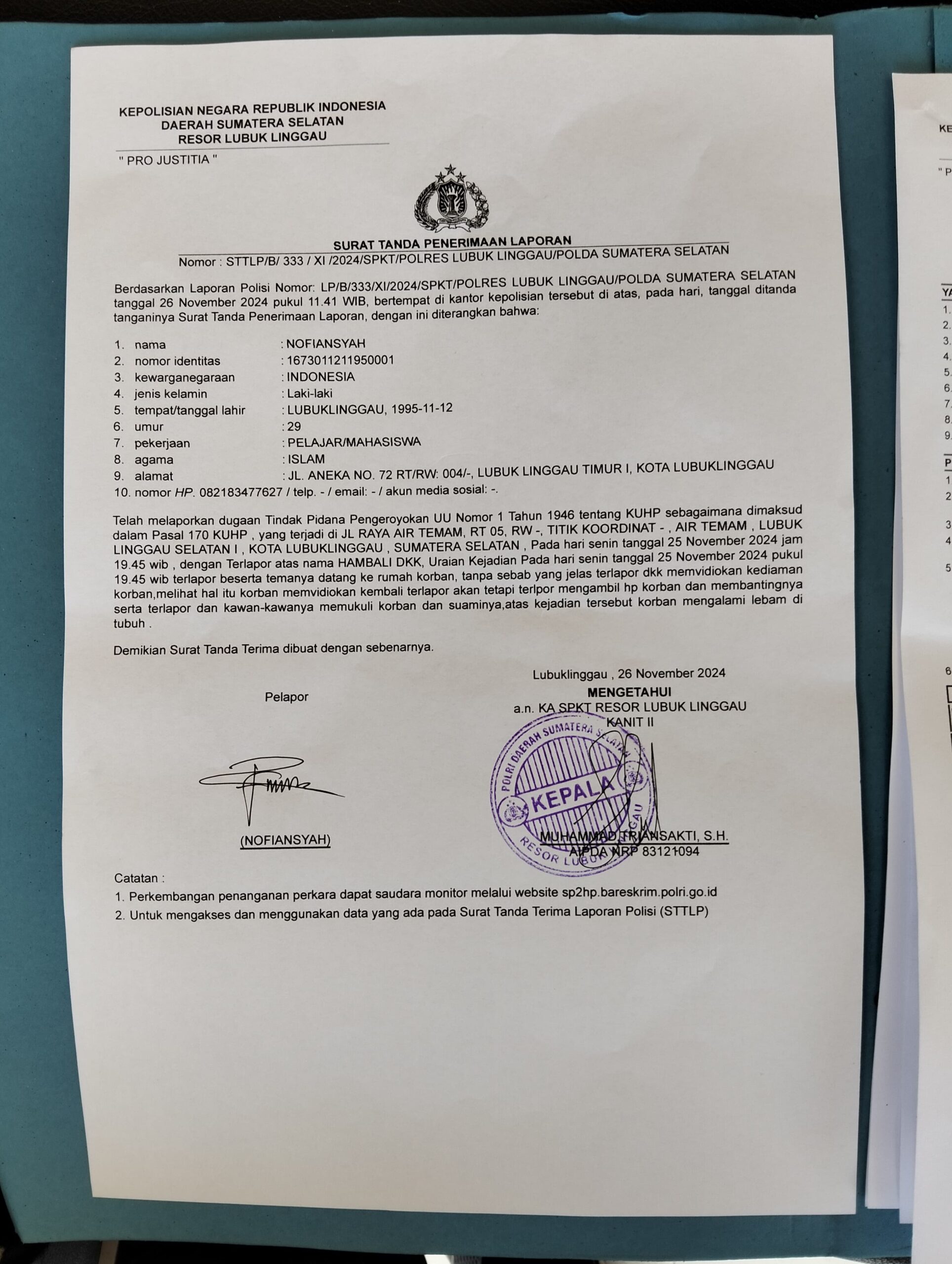 Insiden penganiayaan tersebut, terjadi di kediaman korban yang mengakibatkan korban harus mendapatkan perawatan intensif di RS. Ar Bunda, Kota Lubuk Linggau.