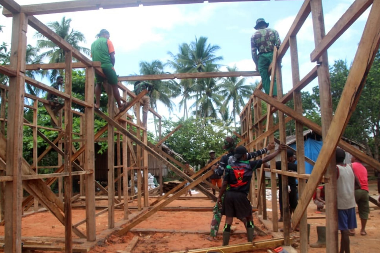 MERAUKE – Masyarakat Kampung Okor Distrik Haju Kabupaten Mappi, selalu ikut serta membantu dalam pembangunan rumah masyarakat melalui program TMMD Ke-112 Kodim 1707/Merauke.