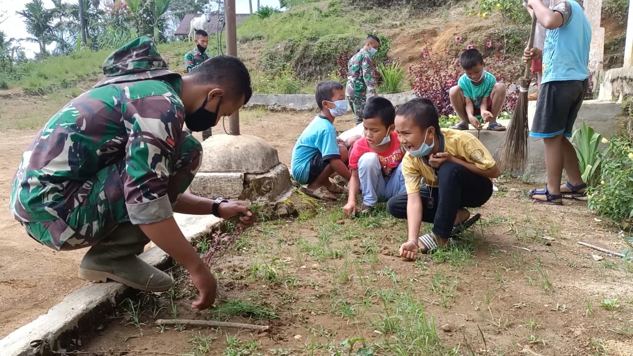 Hari kedua puluh dua TMMD ke-111 Kodim 0212/TS Prada Faisal Chaniago CS bermain sambil bersihkan SDN 100.112 di lapangan sekolah, Desa Siuhom, Kec.Angkola Barat, Tapsel, Prada Faisal Chaniago, Selasa (6/7/2021), mengatakan Antusias tinggi anak-anak diajak bermain Satgas TMMD Kodim Tapsel.
