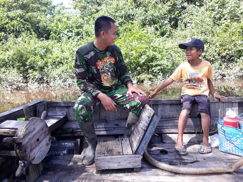 Kapuas,- Anggota Satgas TMMD Reguler ke-110, Kodim 1011/KLK Sertu Ari saat jam beristirahat siang, duduk bersama anak-anak Desa Saka Lagun, Kecamatan Pulau petak, Kabupaten Kapuas untuk bermain sejenak sambil mengajarkan Arifin (7) hapalan Pancasila dan nama-nama Presiden Indonesia Jumat (19/03/2021).