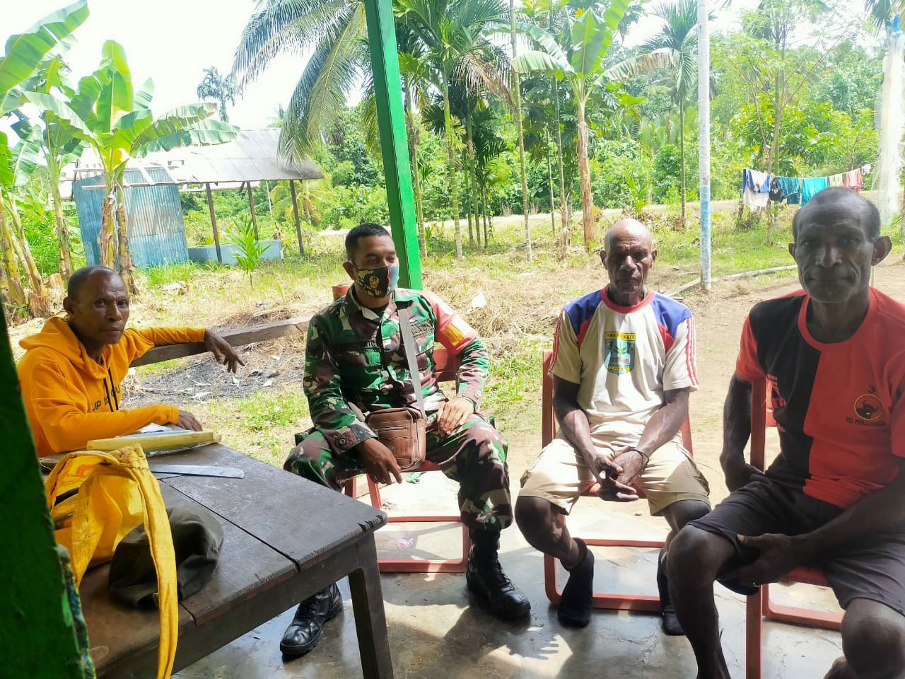 Babinsa Anggota Satgas TMMD ke-111 Kodim 1712/Sarmi, Sertu Supriyanto, melaksanakan Komsos dengan warga Kampung Dorba, Distrik Pantai Timur, Papua, Rabu (2/6/2021).