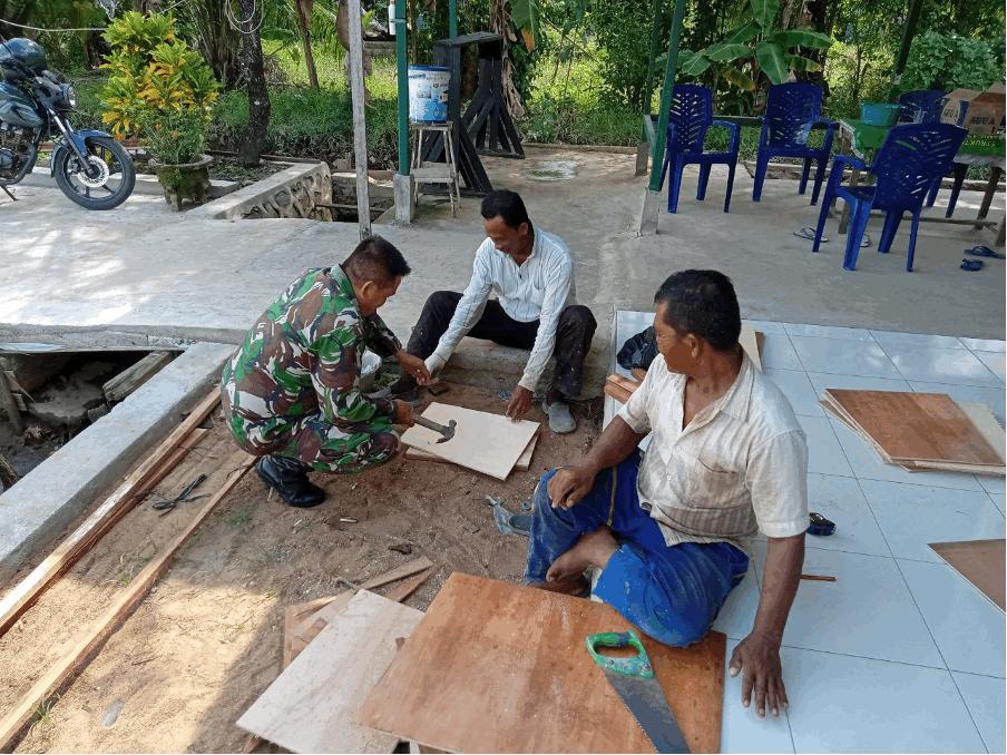 Sebanyak 150 tiang bendera merah putih yang disiapkan untuk TMMD ke-111 yang akan dilaksanakan di Dusun Maju Jaya, RT03/RW02, Desa Kuala Mandor B, Kec. Kuala Mandor B, Kab. Kubu Raya, anggota Koramil bersama dua orang tukang bersama-sama membuat kotak tiang bendera. Material berupa triplek, reng, pasir, dan semen merupakan kelengkapan yang digunakan.