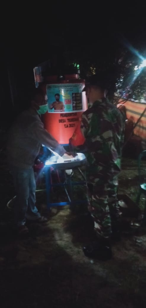 Landak – Dalam upaya meminimalisir penyebaran Covid-19, Babinsa Koramil Ngabang Sertu Solehan melaksanakan pemantauan penerapan protokol kesehatan (Prokes) resepsi pernikahan warga di Desa Tebedak, Kecamatan Ngabang Sabtu (22/5/2021) malam.