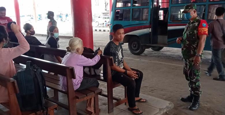 Landak – Dengan mengedepankan sikap humanis, Babinsa Koramil 11/Ngabang, Serda Kiswanto melaksanakan sosialisasi dan disiplin protokol kesehatan (Prokes) di terminal Ngabang, Kabupaten Landak, Minggu (13/6/2021)