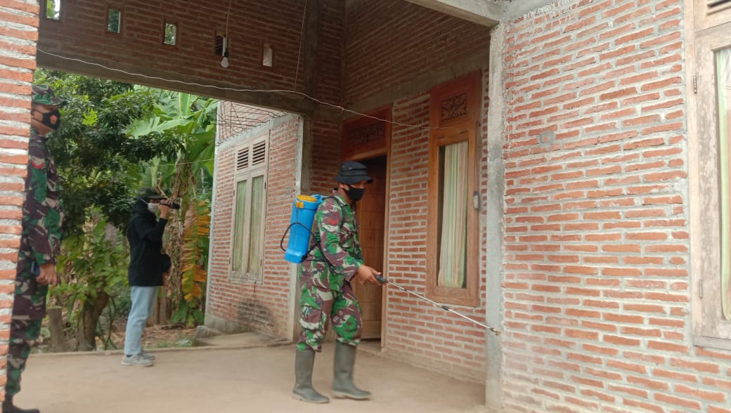Pati – Babinsa Koramil 16/Jaken, Sertu Jumroni bersama anggota babinsa lainnya melaksanakan penyemprotan disinfektan ke rumah-rumah warga yang ditempati oleh anggota BKO Satgas TMMD 111 Kodim 0718/Pati, Desa Tamansari, Kecamatan Jaken, Kabupaten Pati, Kamis(17/6/2020).