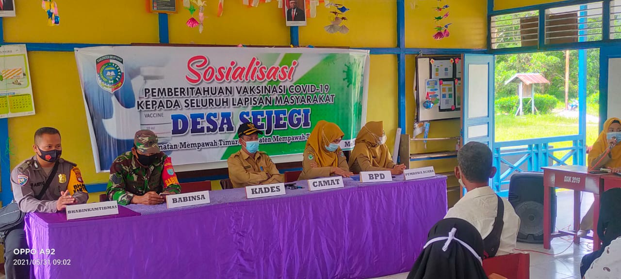 Mempawah – Babinsa 1201-03/Mempawah Hilir, Serma Supriadi mendampingi tim sosialisasi vaksin Covid-19 dari Puskesmas Antibar di Desa Sejegi, Kecamatan Mempawah Timur, Selasa (1/6/2021)