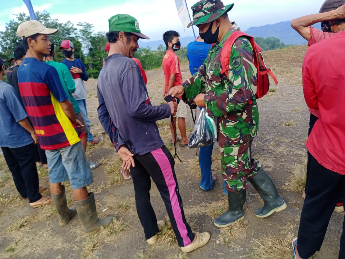 Tampak terlihat Sertu Priyono, Anggota satgas TMMD Kodim 0704/Banjarnegara, yang sedang membagikan masker kepada masyarakat yang akan mengikuti kegiatan dilokasi sasaran TMMD Reg 111 Kodim 0704/Banjarnegara.