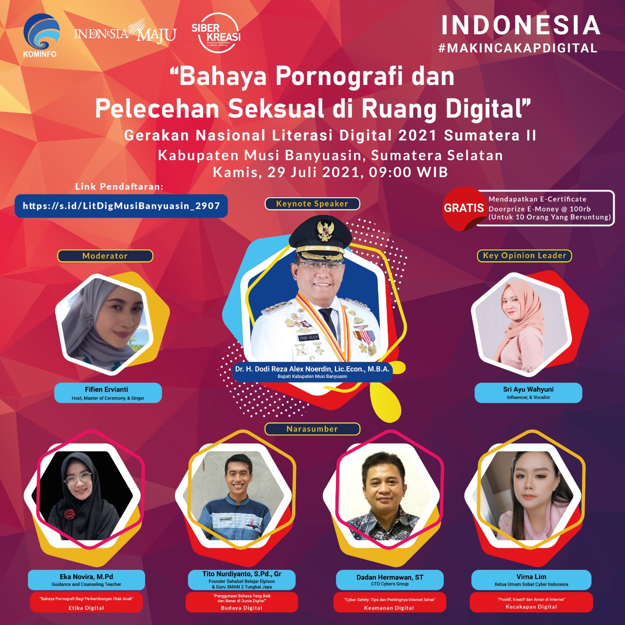 Sebagai Keynote Speaker, Bupati Kebupaten Musi Banyuasin yaitu, Dr. H. Dodi Reza Alex Noerdin, Lic.Econ., M.B.A., memberikan sambutan tujuan Literasi Digital agar masyarakat cakap dalam menggunakan teknologi digital, bermanfaat dalam membangun daerahnya masing masing oleh putra putri daerah melalui digital platform. Bp. Presiden RI, Bapak Jokowi juga memberikan sambutan dalam mendukung Literasi Digital Kominfo 2021.