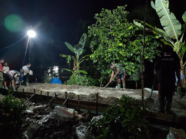 Meski hujan baru saja reda dan cuaca sangat dingin di malam hari, tak menyurutkan semangat anggota satgas TMMD bersama warga untuk melanjutkan pengecoran jalan rabat beton di Desa Kuala Mandor B. Hal ini dilakukan agar pekerjaan yang sudah hampir sebulan ini dikerjakan cepat selesai dan bisa dimanfaatkan oleh warga sekitar untuk aktifitas sehari-hari.