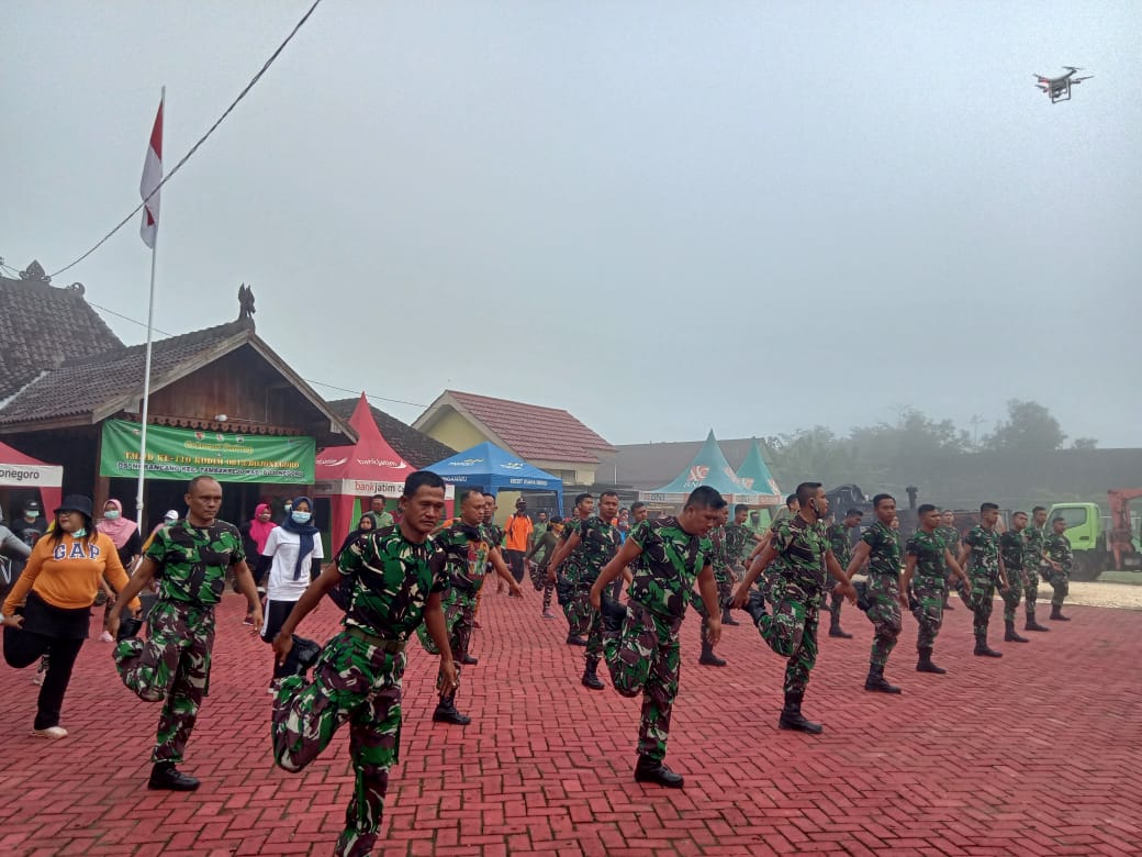 Bojonegoro, Suasana yang berbeda terlihat di Balai Desa Ngrancang, Kecamatan Tambakrejo Kabupaten Bojonegoro. Pasalnya, para anggota TMMD di sana sedang olahraga bersama warga.