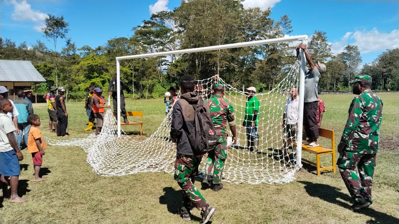 Wamena – Kepedulian terhadap generasi muda terus ditunjukkan oleh Satgas TMMD Ke-126 Kodim 1702/Jayawijaya. Bertempat di Kampung Algonik, Distrik Piramid, Satgas menyerahkan satu set jaring gawang sebagai sarana pendukung kegiatan olahraga pemuda setempat. Jumat (17/10/2025).