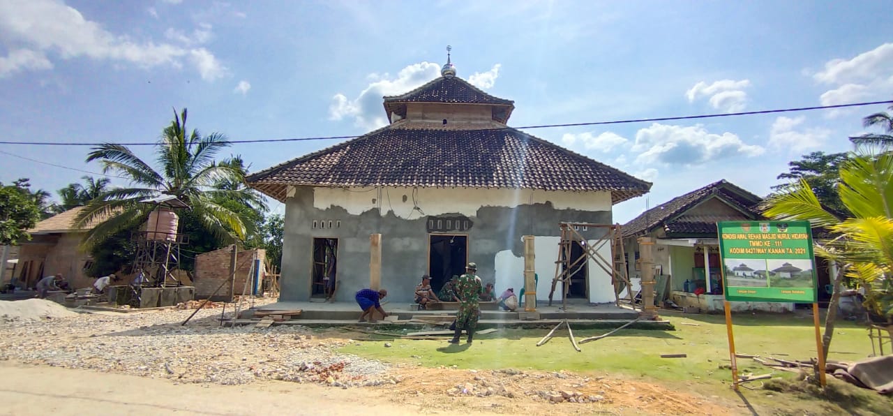 WAY KANAN – Program Pra TMMD ke-111 Kodim 0427/Way Kanan di Kampung Negeri Batin Kecamatan Umpu Semenguk Kabupaten Way Kanan telah memasuki hari ke-8. Selasa (8/6/2021). Prajurit TNI dan warga terus berupaya semaksimal mungkin untuk merampungkan sasaran yang sudah ditentukan, salah satunya perehaban Masjid Nurul Hidayah dan pembangunan MCK di Dusun Srijaya Mulya Kampung Negeri Batin.