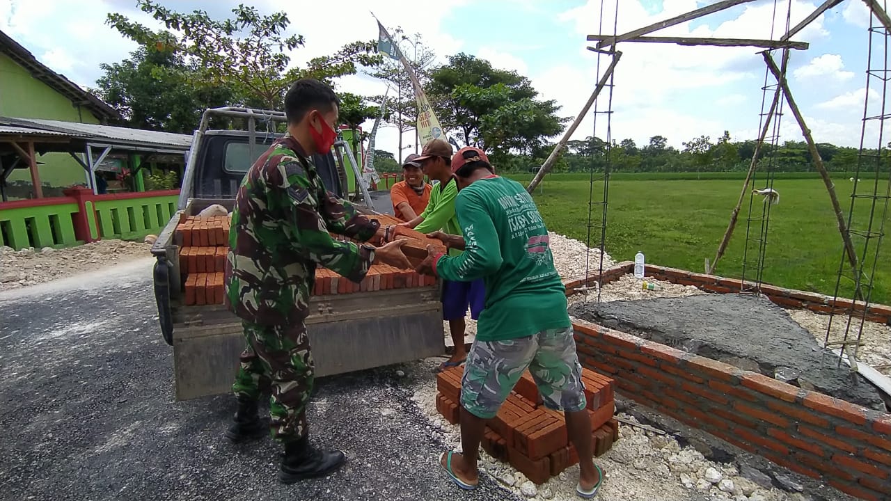 Satgas TMMD Ke- 110 Kodim 0813/Bojonegoro, Sertu Edi bergotong-royong bersama masyarakat membantu menurunkan batu bata untuk monumen ini, Minggu (21/03/2021).