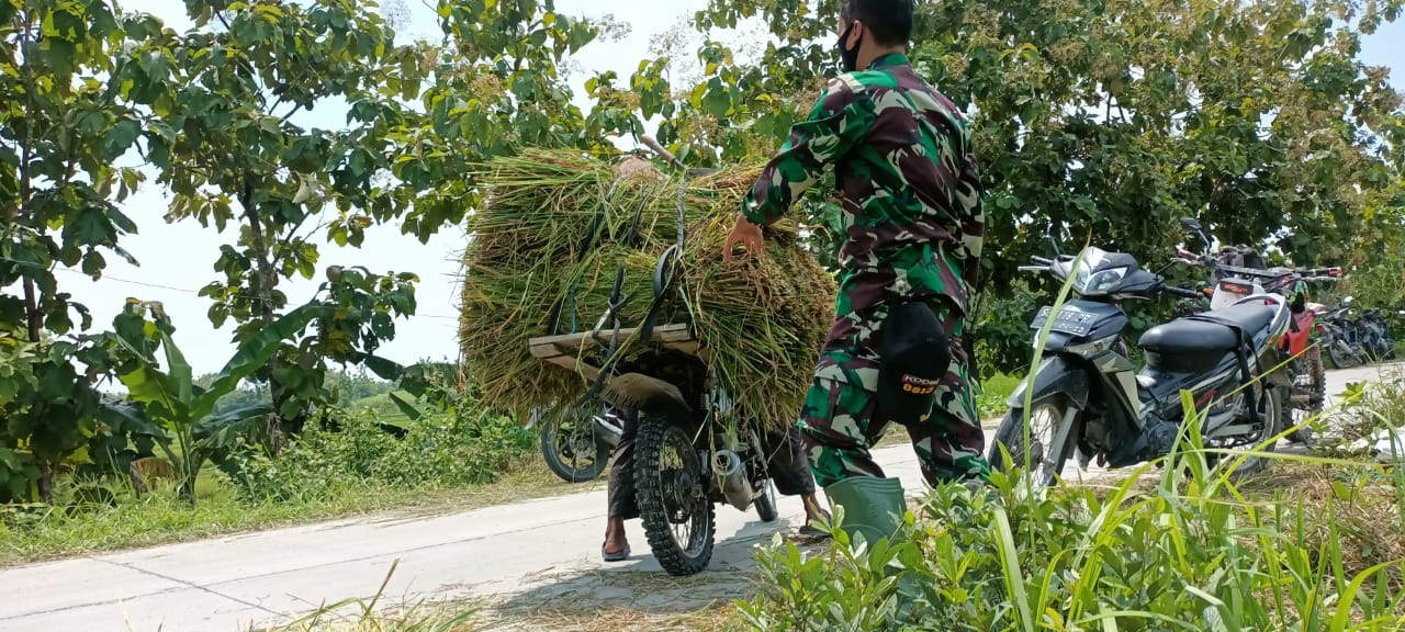 Seperti yang dilakukan Anggota Satgas TMMD ke-110 Kodim 0813/Bojonegoro, Kopda Imam. Dia ikut membantu menaikan jerami pak Jumari keatas motor yang akan digunakan sebagai pakan ternak sapi.