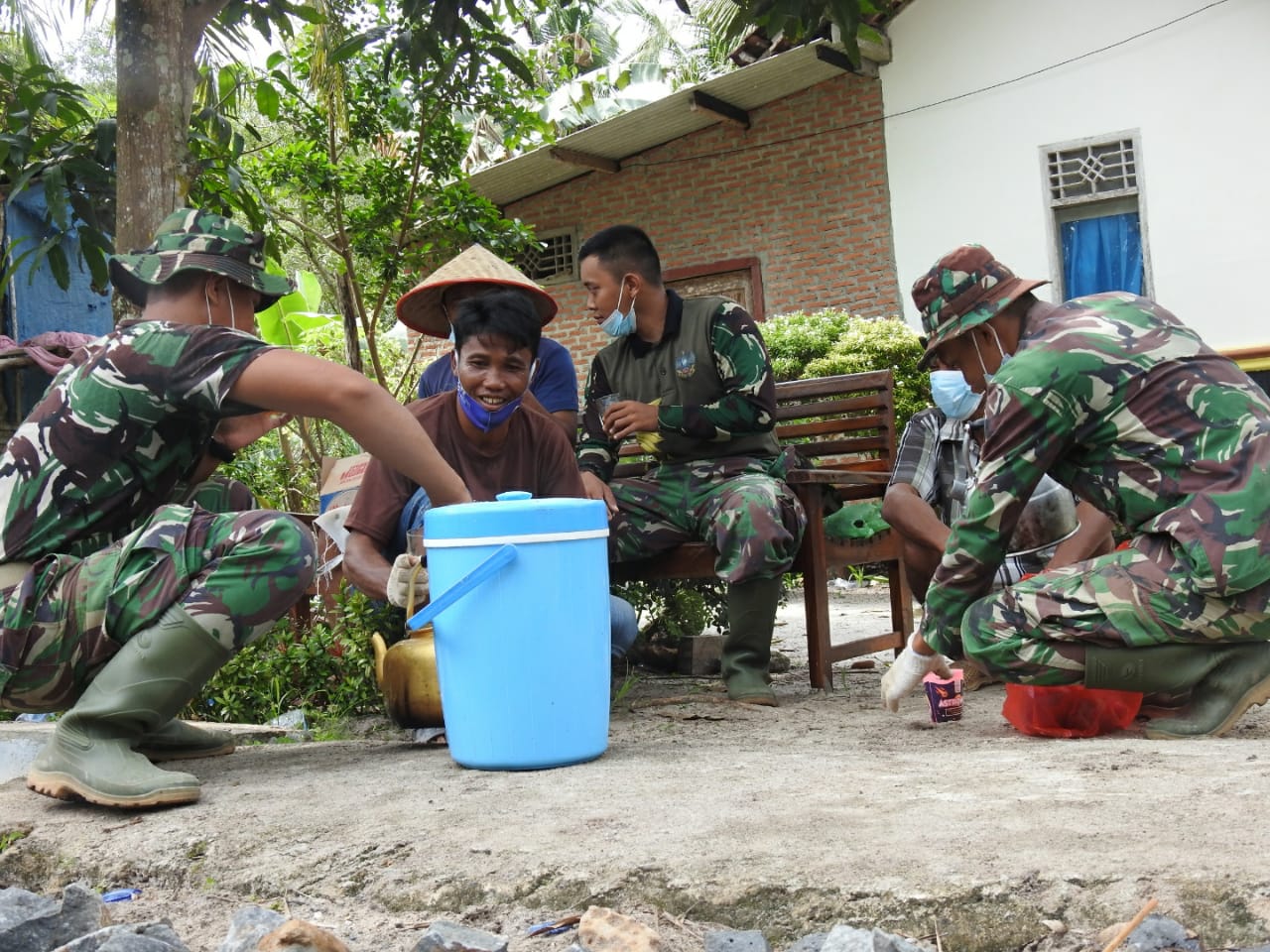 Lampung Timur, Suasana canda tawa penuh dengan keakraban antara Tim Satgas TNI Manunggal Membangun Desa (TMMD) Ke-110 TA. 2021 Kodim 0429/Lamtim bersama dengan warga, di sela-sela aktivitas pembangunan sasaran fisik di Desa Sukorahayu, Kecamatan Labuhan Maringgai, Lampung Timur, Selasa (9/3/2021).