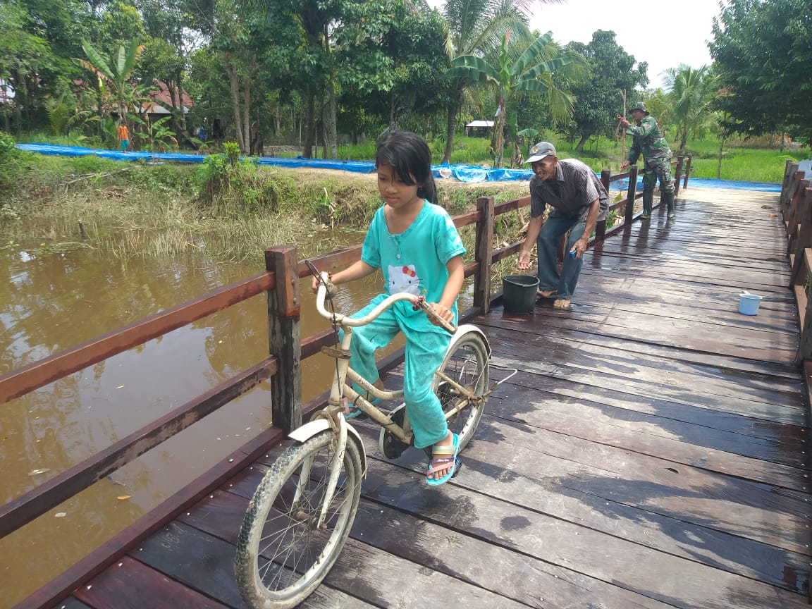 Kapuas,- Manfaat pembangunan jembatan oleh Satgas TMMD ke-110, Kodim 1011/KLK, di Desa Saka Lagun, Kecamatan Pulau Petak, Kabupaten Kapuas, sangat memberikan perubahan dan nampak besar untuk warga sekitar. Tidak hanya orang dewasa, Siti Aminah (8) seorang anak Desa ikut merasakan fasilitas tersebut dengan mengenderai sepeda ia menuju rumah temanya untuk bermain Minggu (21/3/2021), dengan melintasi jembatan buatan Satgas TMMD.