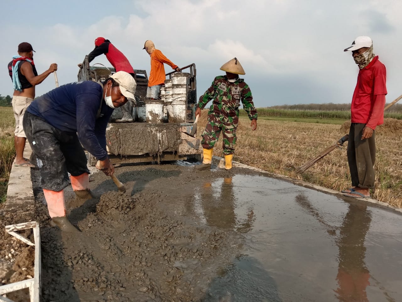 Terlihat sertu Imron dengan sepatu boot andalanya bekerja dengan semangat dan hati-hati saat meratakan adukan bahan material yang telah dituang ke jalan.