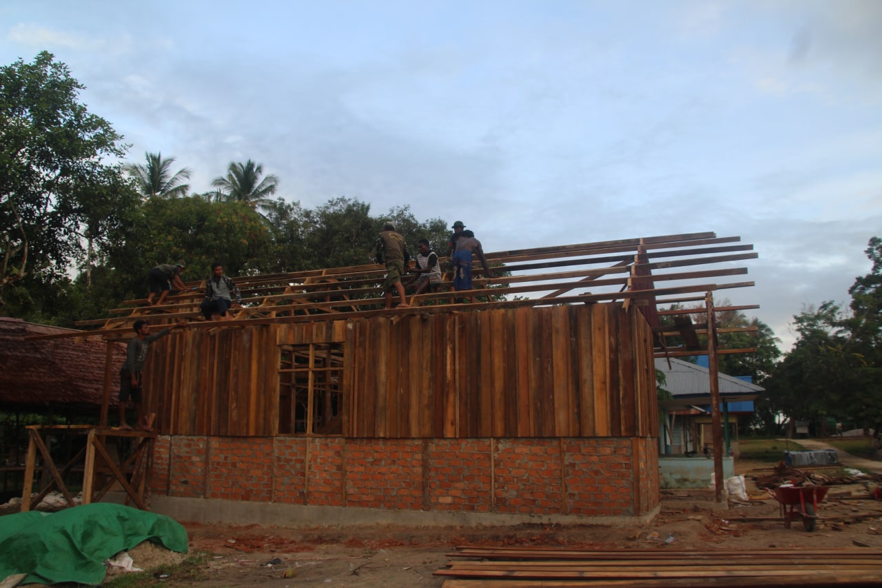 MERAUKE – Berkat semangat dan kerja keras personel Satgas TMMD bersama masyarakat, pembangunan rumah di Kampung Okor melalui program TMMD ke-112, sampai saat ini sudah ada beberapa unit rumah yang pembangunannya mencapai pemasangan rangka atap seng.