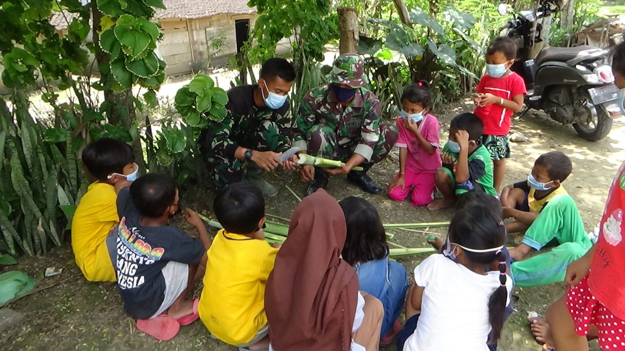 Nampak dari pantauan media ini, seorang Satgas TMMD sedang mengajari mereka membuat mainan yang terbuat dari pelepah pisang. Selanjutnya pelepah itu dirakit menjadi senjata untuk bermain perang-perangan.