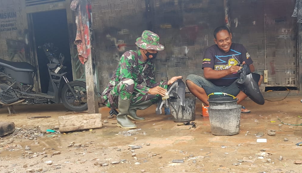 Pati – Sunardi (36) warga Dukuh Pandahan RT.01/03 Desa Tamansari, Kecamatan Jaken, Kabupaten Pati, terlihat tersenyum ketika berbincang-bincang dengan Serda Sukarji anggota Satgas TMMD Reguler ke-111 Kodim Pati yang berkunjung kerumahnya, Kamis (17/6/2021).