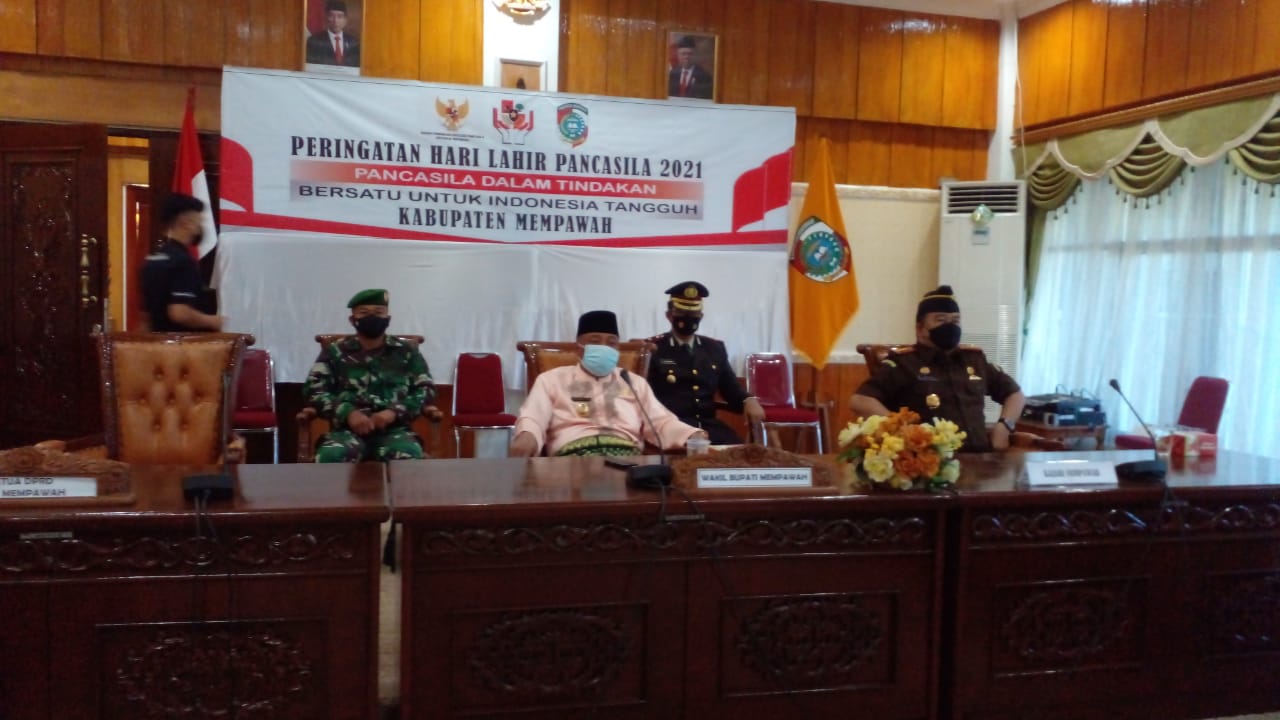 Mempawah – Komandan Kodim 1201/Mph di wakili Pasi Ter Kapten Inf. Dwi Hariyanto bersama Forkopimda Mempawah memperingati Hari Lahir Pancasila secara Virtual di Balai Jujung Titah Kantor Bupati Mempawah, Selasa (1/6/2021).