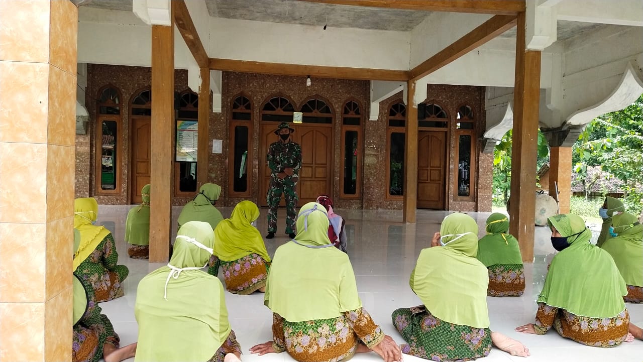 “Kami melakukan sosialisasi protokol kesehatan Covid-19 kepada ibu-ibu Jamaah tahlil Desa Jatimulyo saat perkumpulan rutin bulanan di Masjid Desa Jatimulyo,” ujar Kopda Anang. (Pendim 0813)