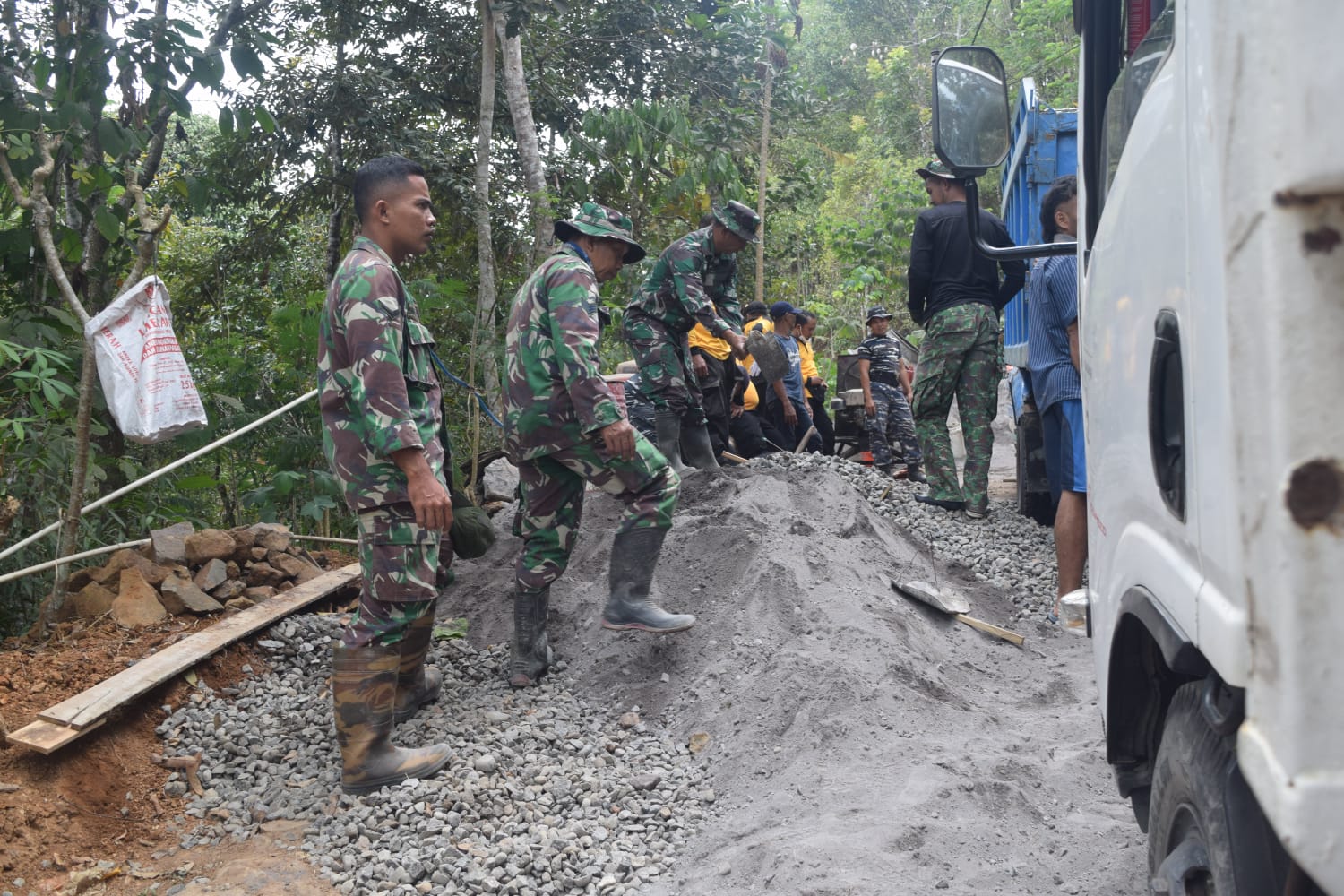 Terlihat kebersamaan personil satgas TMMD ke-118 bersama warga Desa Pejengkolan dengan penuh semangat gotong royong terus berjibaku dengan bahan material pasir, semen, dan batu koral serta air dengan campuran yang terukur serta di bantu menggunakan mesin molen untuk membuat adukan cor semen yang sempurna, sehingga ketahanan bangunan cor jalan akan lebih kuat dan awet.