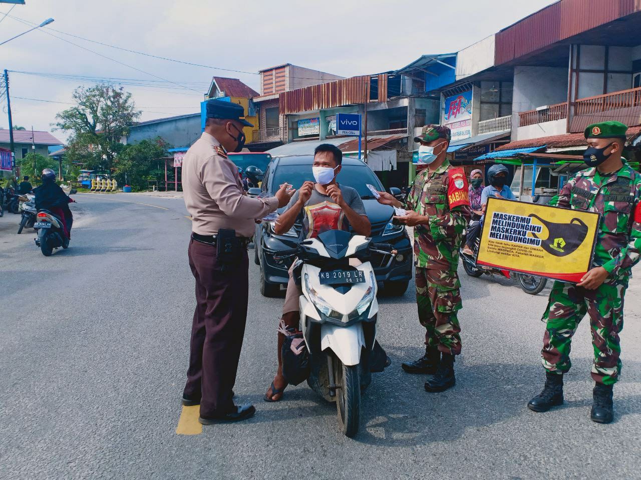 Mempawah – Anggota Koramil 1201-02/Sungai Pinyuh, Kodim 1201/Mph bersama Muspika dan Anggota Yonzipur 6/SD melaksanakan penegakan disiplin protokol kesehatan (Prokes) serta pembagian masker di Pasar Anjongan, Kecamatan Anjongan, Kabupaten Mempawah, Jumat (28/5/2021).