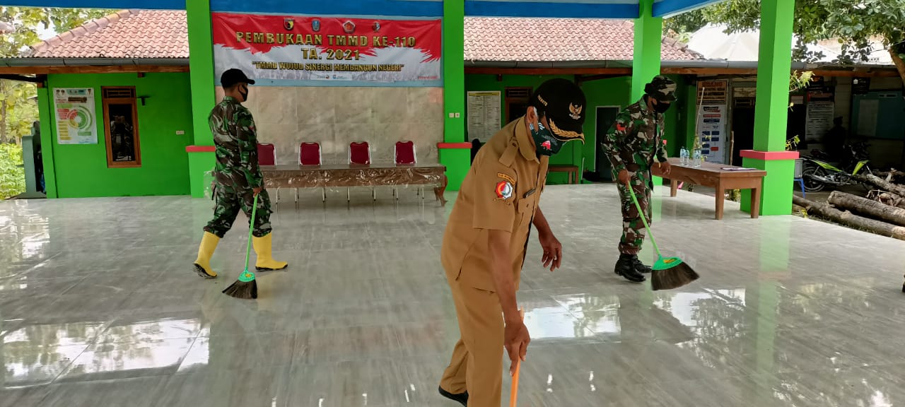 Untuk itu, Anggota Satgas TMMD ke-110 Kodim 0813/Bojonegoro Kopda Puntiono dan Kopda Adi membantu perangkat desa membersihkan Balai Desa Jatimulyo setelah digunakan kegiatan pagi, Selasa(16/3/2021).